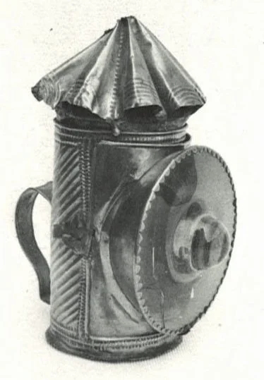 Hand lanterns were made in large numbers from the end of the 17th to the early 18th century. The sources I have found so far are all European, so I cannot say if they were common in the America’s at the time or not. Prior to the mid-18th century, it is safe to say that lanterns in the US colonies would have been imported as the tinsmithing industry had not been solidly established. The style shown here is from Making Fire and Light in the Home, pre-1820, and was made in Britain, Holland, and Belgium. They were made of thin sheet brass with punching and repousse work. The bold fluting of the top cone was very thin and fragile and damaged easily. These rough glass rondels did not focus light but scattered it due to the protrusions and defects (Caspall, 226). The rondels were the by-product of making large spun glass panes, being the middle part where the glass blower’s tool was attached to the glass. Notice also that the glass is held in place by small pointed tabs. Later, into the 19th century, the glass was held in by a flat rim that was machine-formed. The small hand lanterns with the bulbous paper-weight looking lens that are showing up in antique shops are much more modern railroad and police lanterns that came into more common use with the railroads.