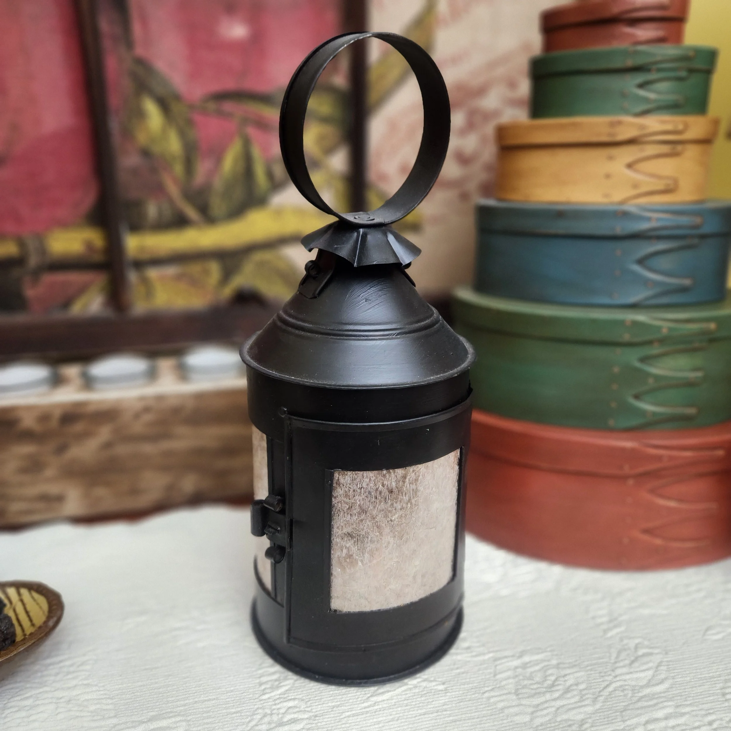 Information on, and examples of mica in lanterns is scarce, and I am continuing to look for more information on the subject. I use two types of mica in my round lanterns as a substitute for horn panes; natural sheets of true mica, and “Lampshade Mica”. The natural mica panes are the same mica sheets that are sold as replacement panes for wood-burning stoves. They can be clear or spotted and are very thin. They resemble the old transparency films for those of us of a certain age. I usually put two layers of natural mica panes in a tin lantern to give the mica a little strength. The lampshade mica is a commercially available product that is made from flakes of natural mica that are mixed in a resin and produced in large flat sheets. The nice thing about the lampshade mica is that it can be heated and easily molded over a mandrel. The lampshade mica gives a decent version of a weathered horn pane look, not perfect, but available.